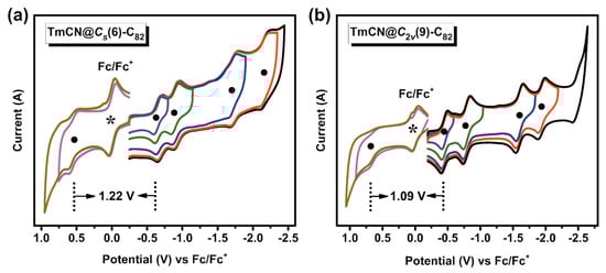 Cyclic voltammograms of (a) TmCN@Cs(6)-C82 and (b) TmCN@C2v(9)-C82 in a o-DCB solution with a scan rate of 100 mV·s−1. TBAPF6 and Fc were employed as the internal standard and supporting electrolyte, respectively. Black circles and asterisks are presented to show the redox and the Fc/Fc+ peaks.