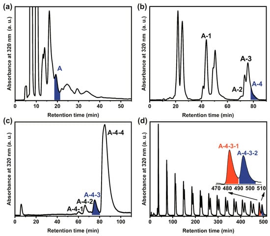 HPLC isolation procedure for TmCN@Cs(6)-C82 and TmCN@C2v(9)-C82. (a) the first stage of HPLC isolation procedure on a preparative 5PYE column (20 × 250 mm). (b) the second stage of HPLC isolation procedure on a preparative Buckyprep-M column (20 × 250 mm). (c) the third stage of HPLC isolation procedure on a semi-preparative 5PBB column (10 × 250 mm). (d) the fourth stage of HPLC isolation procedure on a semi-preparative Buckyprep column (10 × 250 mm). The insert in (d) shows the recycled fractions of A-4-3-1 (red) and A-4-3-2 (blue), which represent the purified TmCN@Cs(6)-C82 and TmCN@C2v(9)-C82, respectively.