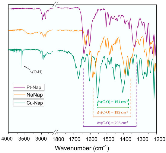 The main bands on the ATR–FTIR spectra of Cu–Nap, Pt–Nap and NaNap are presented in Figure 1. As a complement, the Raman spectra of Cu–Nap, Pt–Nap, NaNap, and cis-[PtCl2(DMSO)2] are presented in Figure 2. The far-IR spectra from 100–500 cm−1 of Cu–Nap and Pt–Nap are presented in Supplementary Figure S1 (Supplementary Materials). In the FTIR spectra, the main absorption bands of NaNap and attributions were at 3564–3143 cm−1 (νOH, broad band), 3057–2830 cm−1 (νCH), 1585 cm−1 (νCOOasym), and 1390 cm−1 (νCOOsym), which were in good agreement with the literature [26]. Meanwhile, the Cu–Nap FTIR spectrum presented a sharp strong band at 3601 cm−1 (νOH), instead of the broad band observed for NaNap. Other main signals (in cm−1) for Cu–Nap were 3064–2800 (νCH), 1554 (νCOOasym), and 1403 cm−1 (νCOOsym). Thus, the difference between the νCOO asymmetric and symmetric stretchings ∆(νCOOasym − νCOOsym) for the Cu–Nap was 151 cm−1, whereas for the free ligand the difference was 195 cm−1. The weak signals from 100–600 cm−1 occurred for Cu–O stretching [27,34]. The broad medium intensity band with a maximum at ~1670 cm−1 may be assigned to the bending mode δ (HOH) of the coordination water molecule in the complex.