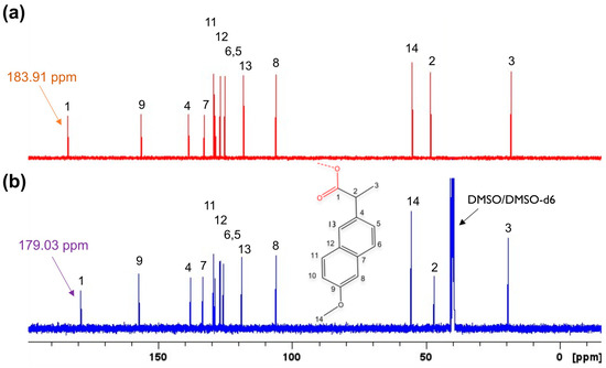 To further evaluate the structure of the Pt–Nap, 1D and 2D NMR spectra were acquired for the complex and sodium naproxenate. The 1H NMR spectrum of the complex is presented in Figure 5, together with the result for the kinetic study of the solvent exchange (DMSO), with measurements at t = 0, 12, and 24 h. The 13C NMR spectra of the complex (DMSO-d6) and the ligand (D2O) are presented in Figure 6a and Figure 6b, respectively. The shifts are numbered according to the attributions for the naproxenate portion corresponding to the schematized molecular structure. The most remarkable information from the 1H NMR spectrum of the complex was the presence of two signals for DMSO. The signal at 2.50 ppm (quintet, 1H) was attributed to the residual peak of the solvent (CHD2(SO)CD3) used in the experiment. The other signal at 2.55 ppm was referred to as DMSO bonded to platinum (singlet, 6H, CH3(SO)CH3). To facilitate the visualization of both DMSO signals, Supplementary Figure S4 shows the 1H signals. Moreover, when analyzing the 13C spectra of the complex and the ligand, it was noted that the C1 (carboxylate group) in the complex shifted to a high field with a Δδ of −4.88. In addition, a small downshift was seen for C2. This observation led us to confirm the coordination of the Nap to Pt(II) by the oxygen atom of the carboxylate group, as will be discussed in the next session.