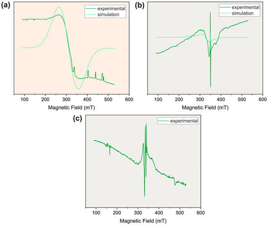 The registered spectra for the complex Cu–Nap (see Figure 8) indicated a paddle-wheel structure, with two copper centers, bridged by four molecules of naproxenate, as observed in the literature [26,27]. The naproxenate molecules were coordinated by the carboxylate groups to both copper centers. At low temperature (77 K), only an isotropic signal was observed, with no hyperfine structure, but at room temperature (293 K), a typical paddle-wheel signal in a binuclear species was detected. Additionally, at room temperature (RT), a radical signal appeared at 350 mT. In the frozen DMSO solution, a central signal probably indicated the formation of a mononuclear species formed by the cleavage of the paddle-wheel structure through the coordination of solvent molecules, with spectroscopic parameters that were quite different from the original binuclear species, as shown in Table 1. The weak signals at ~150 mT and ~470 mT could be attributed to the binuclear species. However, a good fitting with experimental data was not achieved by simulation.