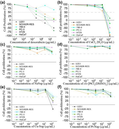 Anti-proliferative profile (%) of (a) doxorubicin (positive control); (b) CuCl2‧2H2O; (c) cis-[PtCl2(DMSO)2]; (d) NaNap; (e) Cu–Nap; (f) Pt–Nap. Human tumor cell lines: U251 = glioblastoma; NCI-ADR/RES = multidrug resistant ovarian adenocarcinoma; 786-0 = adenocarcinoma of kidney; PC-3 = adenocarcinoma of prostate; HT-29 = adenocarcinoma colorectal. Human non-tumor cell line: HaCaT (immortalized keratinocyte). Sample concentration: 0.15–150 μg/mL (naproxenate complexes and starting material); 0.015–15 μg/mL (doxorubicin). Time exposure = 48 h.