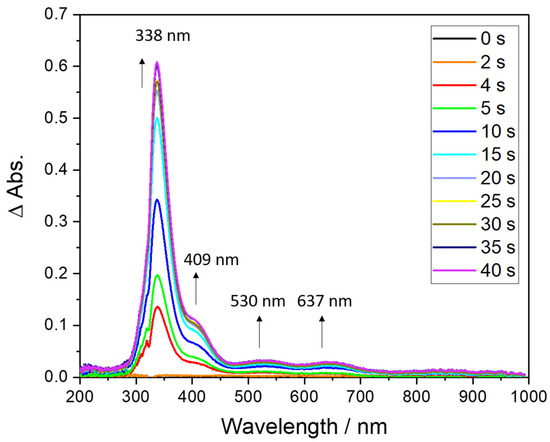 For complex CuI2Ox4, four new bands with wavelengths ranging between 330 and 700 nm appeared rapidly upon addition of dioxygen. In particular, an intense absorption band at λmax = 338 nm (ε ≈ 6400 M−1·cm−1) together with a less intense one at λmax = 409 nm (ε ≈ 1000 M−1·cm−1) were observed. In addition, two low-intensity bands at 530 nm (ε ≈ 350 M−1·cm−1) and 637 nm (ε ≈ 312 M−1·cm−1) were detected. These absorptions correspond to low energy d–d transition, as reported in a parent dicopper complex [27]. The main absorption band at 338 nm is in the typical range of µ-η2:η2-peroxido-CuII2 oxygen species and attributed to ligand-to-metal charge transfer (LMCT) from the peroxido to the copper centers [3]. A similar behavior was obtained with CuI2Ox2Py2. Indeed, a new absorption band was observed at λmax = 367 nm upon addition of dioxygen (ε ≈2400 M−1·cm−1) [3,28] (Figure S5). As for CuI2Ox4, this wavelength value suggests the formation of side-on peroxido dicopper(II) species. However, both Ox4 and Ox2Py2-based peroxides were shown to be poorly stable, hence excluding any further reduction/protonation for generating mixed-valent species such as shown in Scheme 3.