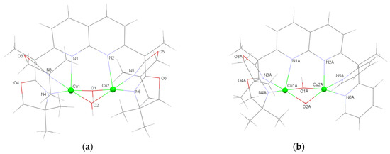 The next step consisted in exploring the redox properties of the dicopper(II) bis(µ-OH) Ox4 and Ox2Py2 complexes. For this purpose, the complexation reactions of the two ligands were carried out in a classical manner. One equivalent of the ligand was dissolved in THF, and 2.1 equivalents of triethylamine and water (10 equivalents) were added followed by 2.1 equivalents of Cu(OTf)2. Upon diffusion of di-isopropyl ether into a concentrated acetonitrile solution of complexes, single crystals for X-ray diffraction analysis were obtained with 71% and 75% yield, respectively. Details for X-ray analysis are in Table 1. Complex 1 (CuII2Ox4) crystallizes as a dinuclear complex with the Cu atoms bridged by two hydroxido groups (Figure 2a) with Cu–O–Cu angles close to 90.4°. The Cu1 and Cu2 copper atoms are set at a short distance from each other (2.7537(5) Å). The geometries of both copper atoms are described as a square-based pyramid (τ = 0.07 for Cu1 and 0.08 for Cu2) [32] with N1 and N2 of the naphthyridine spacer occupying the axial position. Although the equatorial distances are in the range of the values obtained for parent/relevant dinuclear complexes (1.9–2.1 Å) [17,33,34,35], the nitrogen of the naphthyridine is located at 2.43–2.46 Å from the copper(II) centers. These significantly longer distances could indicate a weaker donating group and a possible unbinding of these atoms in solution.