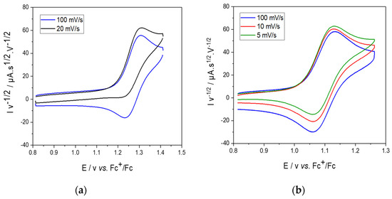 As shown in Figure 3, the two complexes displayed a reversible oxidation system at E1/2 = 1.27 V and 1.09 V vs. Fc+/Fc, respectively, for 1 and 2 at = 100 mV·s−1 rendering them all out of reach of commonly used chemical oxidants [17]. Noteworthy, complex 1 showed a complete loss of reversibility at a lower scan rate (v = 20 mV·s−1) (Figure 3a), contrary to complex 2, for which reversibility was still observed at v = 5 mV·s−1 (Figure 3b). Plots of the normalized anodic peak current against the scan rate (v) (Figure S9) showed a particular increase of at low scan rates for 1. This result is indicative of an ECE mechanism (E = electrochemical and C = chemical) where the oxidation of the complex is followed by a chemical reaction on the experimental time scale, producing new species, which, in turn, can be oxidized. The oxidation of both complexes therefore involves, at room temperature, the formation of a transient species that has a half-life of several seconds. For the oxidation process of each complex, the number of electrons was determined by using the Randles–Sevcik equation [36,37] for scan rate values for which the system remained reversible. was plotted against for complexes 1 and 2 (Figure S10), yielding values of = 1.3 and 1.2, respectively, thus indicating a one-electron transfer for both complexes. This behavior is reminiscent of that previously obtained with complex 3 (CuII2Py4), which displayed a reversible system at 1.26 V vs. Fc+/Fc in the same conditions [17].