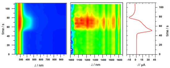 UV-Vis−NIR monitoring of the oxidation of complex 2 via spectroelectrochemistry showing the reversibility of the redox process. Right: current intensity variation with time taken from the CV at = 30 mV·s−1. Conditions: 7 mM in 0.1 M NBu4ClO4 in acetonitrile, optical path = 0.2 mm, working electrode: Pt, room temperature.