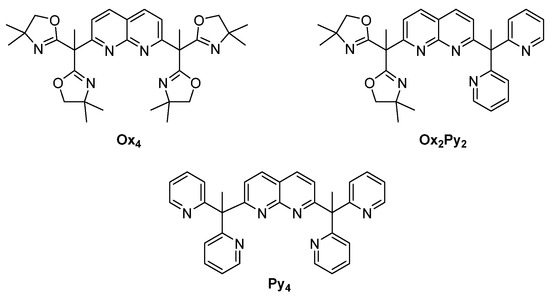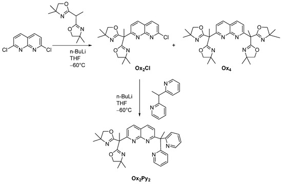 As shown in Scheme 2, the new ligands Ox4 and Ox2Py2 display a common 1,8-naphthyridine spacer, the bis-oxazoline (BOX) or pyridine moieties (Py = 2,2′-dipyridylethane) serving as binding pockets (Scheme 2). The bis-oxazoline [22] and the pyridine (Py) [23] entities were synthesized according to procedures described in the literature. Ox4 was synthesized via lithiation of bis-oxazoline and subsequent reaction with the 2,7-dichloro-1,8-naphthyridine building block (synthesized according to literature procedures, in three steps) [24,25] with 20% yield. The ligand Ox2Py2 was obtained in the same manner after two successive lithiations with 60% yield (Scheme 4). Corresponding 1H (Figure S1) and 13C (Figure S2) NMR are depicted in the Supplementary Materials along with ESI-MS spectra (Figure S3).
