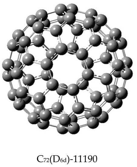 Fullerene cages, their isomers, stabilities, structures, aromaticities, electronic and magnetic properties, and spectra have been the subject of intense scrutiny over the years [,,,,,,] ever since the pioneering work of Smalley and coworkers [] that resulted in the discovery of another state of carbon with a dome-shaped icosahedral structure of C60, named buckminsterfullerene. Subsequent discovery of carbon nanotubes [] further fueled a plethora of research papers related to fullerenes and carbon nanomaterials. Fullerenes are cage-like closed structures that contain 12 pentagons and a varied number of hexagons. Numerous isomers are possible for a fullerene with a given molecular formula; for example, there are 1812 isomers for C60 while there are 8149 isomers for the C70 fullerene.
