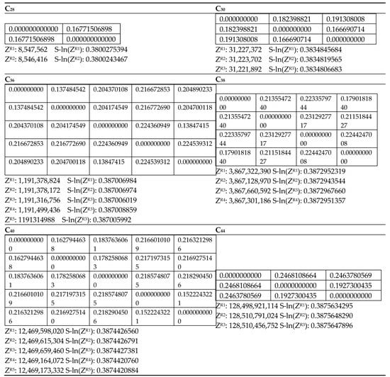 As can be seen from Table 1, Table 2, Table 3, Table 4, Table 5, Table 6, Table 7, Table 8, Table 9, Table 10, Table 11 and Table 12, the matching polynomials of isomers of fullerenes exhibit similarities and, hence, I develop quantitative similarity measures in terms of the similarity matrices that would have the capability to offer a contrast among isomers as well as across the platform of fullerenes. These matrices are defined using the coefficients of the matching polynomials with a scaling incorporated into them. Hence, I define the similarity matrix based on matching polynomials as follows: