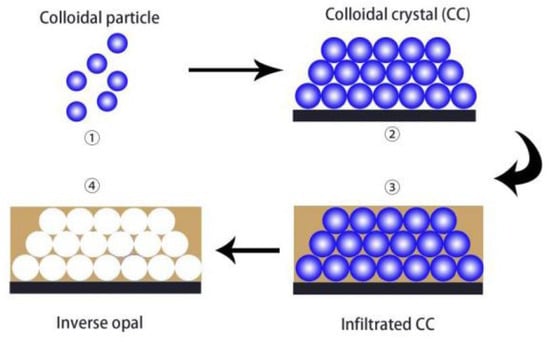 The basic process of the two-step method is as follows: the first step is to disperse the colloidal microspheres in the precursor solution and self-assemble into a composite opal structure. The second step is to remove the microsphere template and obtain the inverse opal structure [38,39].