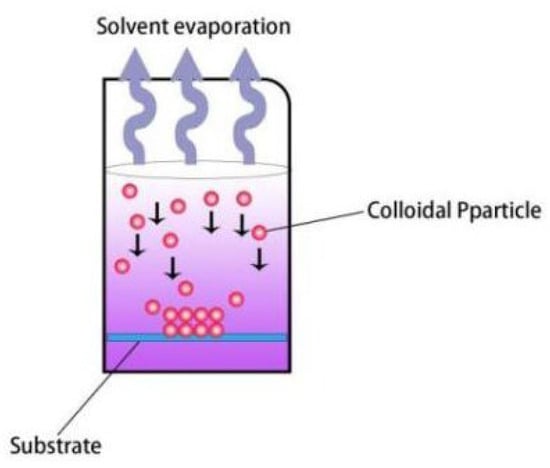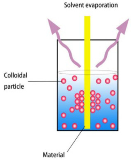 Vertical deposition is also a widely used self-assembly method. Figure 4 is a schematic diagram of the vertical deposition method; that is, the material is vertically placed in the assembly solution of monodisperse colloidal microspheres. With the evaporation of the solvent, colloidal microspheres gather on both sides of the material under the combined action of capillary force and surface tension, forming a periodic photonic crystal structure [45]. Sinitskii A et al. [46] prepared a polystyrene colloidal opal template using the vertical deposition method, and prepared inverse opals based on different oxide materials (TiO2, SiO2, and Fe2O3). Compared with the gravity deposition method, the vertical deposition method has similar advantages and disadvantages, but it can make photonic crystals adhere to both sides of the material [47,48].