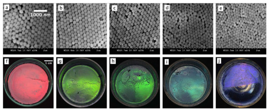 Top view SEM images (a–e) and images (f–j) of colored CC films with SNPs diameters of 350 nm, 282 nm, 270 nm, 249 nm, and 207 nm, respectively; scale bars are displayed in the first image of each set [43].