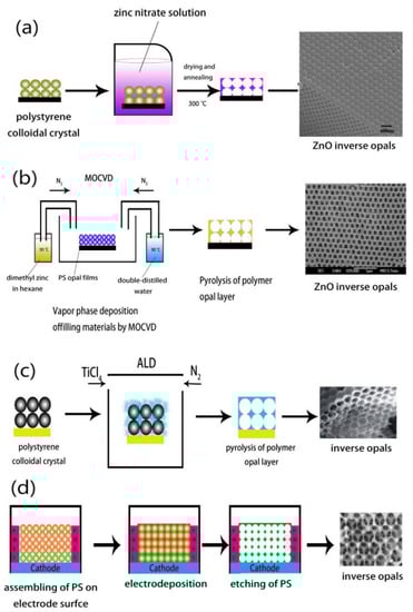 (a) Preparation of inverse opal photonic crystals by sol-gel procedure; (b) preparation of inverse opal photonic crystals by CVD method; (c) preparation of inverse opal photonic crystals by ALD method; and (d) preparation of inverse opal photonic crystals by electrodeposition method.