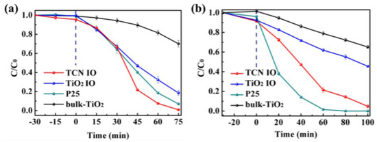 Figure 6. Photocatalytic degradation results in (a) 20 mg/L of RhB and (b) 10 mg/L phenol over the Nitrogen-doped titanium dioxide inverse opal photonic crystal (TCN IO) under simulated sunlight irradiation [55].
