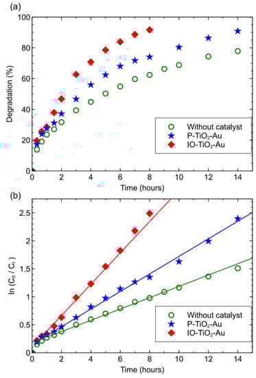 Degradation of methylene blue (1 μmol/L) over time under visible light. Illumination using P-TiO2-Au and IO-TiO2-Au films as photocatalysts, compared to the natural degradation of methylene blue. (a) Degradation percentage, (b) degradation kinetics in logarithmic scale [62].