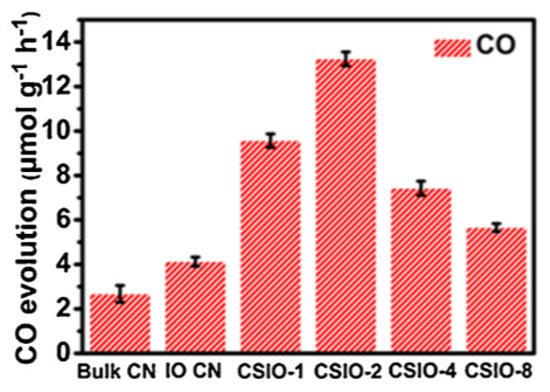 The metal modification method involves loading the surface of nanomaterials via Au [66], Ag, Pt [67], Pd, and other precious metals, so as to improve the separation efficiency of electron-hole pairs. Some researchers also use metal compounds to improve the performance of inverse opal photonic crystal photocatalysts. Huang et al. [68] developed a new type of CuS-loaded inverse opal g-C3N4 photocatalyst (CN) to improve its photocatalytic activity for CO2 reduction via the surface modification of CuS nanoparticles. In the experiment, inverse opal g-C3N4 with a good optical response and pore structure was prepared and characterized. Then, CuS nanoparticles were prepared by hydrothermal method and dispersed in toluene. Then, the CuS nanoparticles solution was added to the surface of inverse opal g-C3N4 and calcined at 110 °C for 1 h to obtain the CuS-modified inverse opal g-C3N4 photocatalyst. Finally, the photocatalytic reduction of CO2 was carried out using the catalyst, and its photocatalytic performance and mechanism were studied. The CO generation rate is shown in Figure 8. The results showed that the optimal loading of CuS was 2 wt%, and the corresponding CO-evolution was 13.24 μmol·g−1·h−1, which is 3.2 times that of IO CN and five times that of bulk CN.