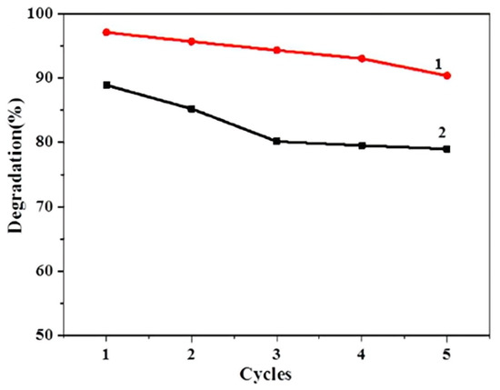 In order to develop an efficient inverse opal photonic crystal photocatalyst, the photocatalyst was modified by doping non-metallic elements such as C, P [69], N [70], and S on the structural basis of inverse opal photonic crystals. Some researchers have used a variety of non-metallic materials mixed with doping to improve the photocatalytic performance of inverse opal photonic crystals. Wenjun Zhang [71] prepared N-CD (nitrogen-doped carbon dot) via the one-step hydrothermal method and then used it to sensitize highly ordered porous TiO2 IOS (TiO2 inverse opals) films. Under simulated sunlight irradiation, the photocatalytic energy of N-CD/TiO2 IOS and CD/TiO2 IOS were compared. As shown in Figure 9, the photocatalytic degradation rate of MB (methyl blue) of the N-CD/TiO2 IOS film also reached about 90% (curve 1), while the degradation rate of the CD/TiO2 IOS film after five cycles was about 80% (curve 2). This fact illustrates that, in the photocatalytic degradation of MB molecules, the N-CD/TiO2 IOS film has a higher catalytic performance and stability than the CD/TiO2 IOS, because the n-doped atoms themselves have redox catalytic ability and the N-CD has a wider absorption range (UV and visible light regions).