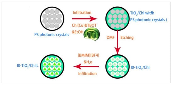 In some studies, the inverse opal photocatalyst was combined with biomimetic chloroplast to improve the photocatalytic efficiency of inverse opal photonic crystal(Figure 10). Zhou et al. [73] took advantage of this characteristic and combined an inverse opal photonic crystal with bionic chloroplasts to improve its photocatalytic efficiency. Specifically, the researchers first prepared TiO2 in an inverse opal template. The inverse opal structure, then the surface of the pore in the inverse opal structure, was loaded with chlorophyll (Chl) molecules and ionic liquid (IL) via the cation exchange method. Through the characterization and performance test of the prepared materials, the authors found that the material demonstrated good absorption properties in the UV-visible light region and displayed high photocatalytic activity. The CO2 conversion rate reached 28.6%. In order to further improve the efficiency of photocatalysis, the author designed a “light-charge separation-transfer” mechanism based on the photosynthesis process in chloroplasts in nature. Under this mechanism, light energy was composed via TiO2 in the inverse opal structure. The particles absorb and release the electrons, which were taken up by the chlorophyll loaded on the surface, where it was then efficiently excited into the biomass. The slow light effect in the inverse opal structure improved the light absorption and utilization efficiency of the material, enabling more photons to be absorbed and excite the charge, thus improving the photocatalytic efficiency. At the same time, the chlorophyll molecules in the inverse opal structure are able to form the biomimetic chloroplast structure, and the “light-charge separation-transfer” mechanism was adopted so that the light energy could be efficiently converted into biomass (CH4), which further improved the photocatalytic efficiency. The slow light effect and biomimetic chloroplast structure in inverse opal structure are interrelated and act on the performance of the whole material. The slow light effect improves the light absorption and utilization efficiency, while the bionic chloroplast structure realizes the light-charge separation and efficient transformation.