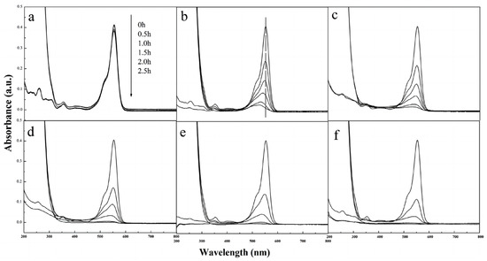 UV-vis absorption spectrum of RhB degraded by as-prepared samples under visible light irradiation; (a) self-degradation; (b) T-Sol; (c) IOT-230; (d) IOT-330; (e) IOT-440; (f) IOT-610 [81].