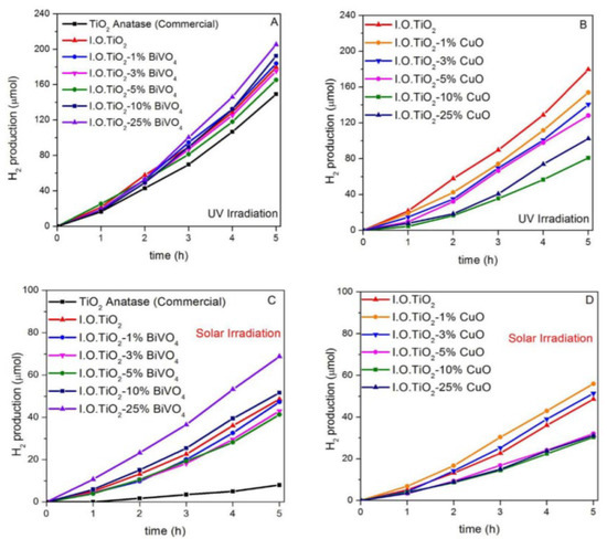 H2 production of the inverse opal TiO2 (I.O.TiO2) system under UV and sunlight irradiation. (A) Inverse Opal TiO2-BiVO4 and (B)Inverse Opal TiO2-CuO composites under UV irradiation; (C) Inverse Opal TiO2-BiVO4 and (D) Inverse Opal TiO2-CuO under solar light irradiation [84].