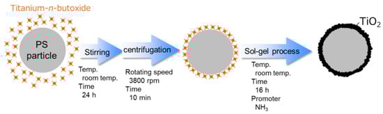 Herein, we report PS@TiO2 core–shell particles synthesized using the sol–gel method. In this method, TiO2 shells were formed on the surfaces of PS particles. Homogeneous spherical particles were obtained by adjusting the reaction temperature and amount of the promoter aqueous NH3 solution. A schematic illustration of the synthesis of the PS@TiO2 core–shell particles is shown in Figure 1. Experimental observations confirmed that the diameters of PS@TiO2 core–shell particles were approximately 220 nm. Furthermore, TiO2 was confirmed to be present on the surfaces of the PS@TiO2 core–shell particles. The photocatalytic activity of the PS@TiO2 core–shell particles was evaluated using MB decomposition. The PS@TiO2 core–shell particles showed better performance than that of the commercial P25.