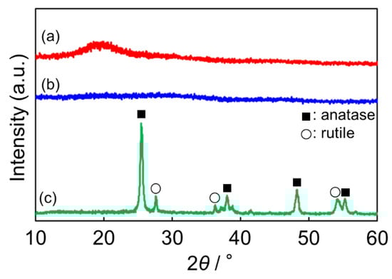 The crystallinity of the samples was measured using powder X-ray diffraction (XRD). Figure 5 shows the XRD patterns of the PS@TiO2 core–shell particles, the prepared TiO2, and the commercial P25. The PS@TiO2 core–shell particles showed a broad diffraction peak, whereas the prepared TiO2 showed no peak, indicating that both samples were composed of an amorphous phase. Meanwhile, the commercial P25 showed sharp peaks, indicating that it was composed of rutile and anatase phases [].