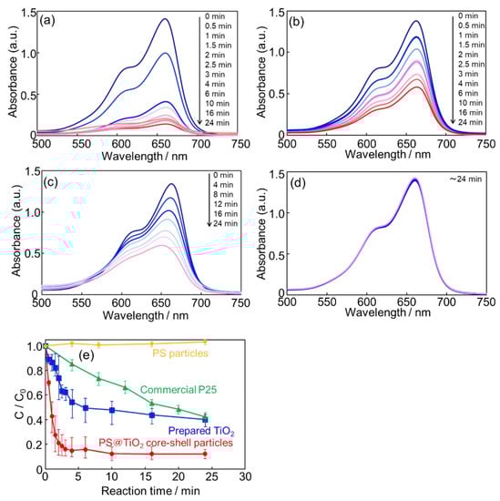 UV-Vis absorption spectra of the reaction solutions with (a) PS@TiO2 core–shell particles, (b) prepared TiO2, (c) commercial P25, and (d) PS particles. (e) Relationship between C/C0 and the reaction time for MB decomposition.