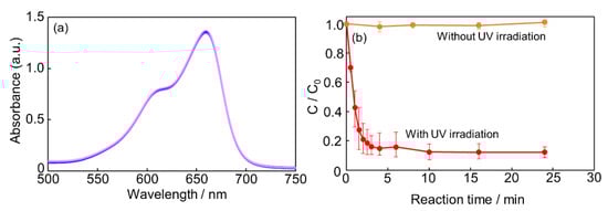 The PS@TiO2 core–shell particles were used in MB decomposition with and without UV irradiation to evaluate their photocatalytic activity. Figure 7a shows the UV-Vis absorption spectra of the reaction solutions with the PS@TiO2 core–shell particles without UV irradiation. The intensity of the absorption peak at 664 nm was unchanged without UV irradiation. Figure 7b shows the reaction time dependence in the presence of the PS@TiO2 core–shell particles with and without UV irradiation. With UV irradiation, 87% of MB degraded after 24 min, as described in the above results, whereas without UV irradiation, MB decomposition was not promoted.