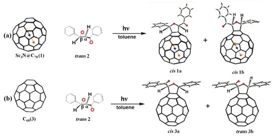 In 2022, Chen et al. [49] reported the 1,3-dipolar cycloaddition photoreaction of Sc3N@D3h-C78 with carbonyl ylide affords two isomeric mono-adducts 1a and 1b under light irradiation (see Figure 1a). The single crystal X-ray diffraction confirmed that both mono-adducts 1a and 1b have the same addition sites at a closed [6,6] bond and possess the same cis-conformation, namely, in which the hydrogen atoms of two methines situated at the same side of the tetrahydrofuran ring with parallel orientation [49]. However, two isomeric mono-adducts 3a and 3b were got when Sc3N@D3h-C78 was replaced by C60 in a similar reaction under the same condition [49]. Surprisingly, the crystal structure of 3b shows that the addition pattern is located at the closed [6,6]-bond and exhibits a trans-conformation, in which the hydrogen atoms of the two methines within the tetrahydrofuran ring located at the opposite sides (see Figure 1b) [49]. In contrast, 3a has the cis-conformation based on the 1H NMR spectrum which has been previously reported by Wang and Yang [50,51]. Furthermore, the DFT calculation results indicated that the synergistic contributions of thermodynamics of adducts, the most reactive C-C bond, and the cis-dipole intermediate from trans 2, result in the high regioselectivity of cis-conformations of 1a and 1b [49].