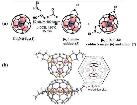 Though the mono-adducts of Prato reaction of M3N@C80 (M = M = Sc, Y, Gd, Dy, Ho, Er, Lu) have been widely reported [1,2], the corresponding bis-adducts are rare. Aroua et al. [52] synthesized the bis-adducts of the Prato reaction of Gd3N@Ih-C80 and Y3N@Ih-C80 in 2015. Later on, Cerón et al. [53] obtained 1,3-dipolar bis-additions of Sc3N@Ih-C80 and Lu3N@Ih-C80 using the tether-controlled multi-functionalization method, but the unambiguous crystal structure characterization of these reported Prato bis-adducts are missing. Fortunately, Semivrazhskaya et al. [54] reported one precise crystal structure of two bis-ethylpyrrolidinoadducts of Gd3N@Ih-C80 (4) obtained by regioselective 1,3-dipolar cycloadditions; see Figure 2a. The crystal structure of the minor-bis-adduct (7) shows a C2-symmetric carbon cage with [6,6][6,6]-addition sites, as shown in Figure 2b and a strictly planar Gd3N cluster, which is much less strained compared to a pyramidalized cluster of the pristine Gd3N@Ih-C80. Indeed, two interior Gd atoms coordinated to the C80 cage at two sp3 addition sites, releasing the strain of the endohedral Gd3N cluster in the minor-bis-adduct. However, the structure of major-bis-adduct was presumably asymmetric [6,6][6,6]-addition sites, because its visible - near infrared (vis-NIR) spectra are almost identical to that of the major bis-adduct of Y3N@C80 with an asymmetric [6,6][6,6]-structure. Moreover, it is experimentally observed that the symmetrical minor-bis-adduct of Gd3N@Ih-C80 isomerized to the asymmetrical major-adduct and based on the linear transit calculations, a pathway of the isomerization is through the formation of the [6,6][6,6]-bis-adduct, followed by [5,6][6,6]-bis-adduct [54].