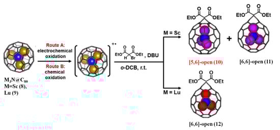 Notably, a new route to synthesize the Bingel–Hirsch derivative of EMFs via the cationic metallofullerenes was reported by Hu et al. recently, as shown in Figure 3 [62]. M3N@Ih(7)-C80 (M = Sc or Lu) cations were generated by both electrochemical and chemical oxidation and then the cations successfully underwent the typical Bingel–Hirsch reaction [62]. For Sc3N@Ih(7)-C80, both [5,6]-open (10) and [6,6]-open (11) adducts have been obtained whereas the former has never been synthesized via the neutral NCFs [62]. However, only a [6,6]-open adduct (12) was generated for Lu3N@Ih(7)-C80 [62]. DFT calculations implied that the cationic M3N@Ih(7)-C80 was much more reactive than the neutral compound for the Bingel–Hirsch reaction [62]. Furthermore, a new unusual mechanism for the Bingel–Hirsch reaction of the cationic NCFs is proposed, involving an outer-sphere single-electron transfer (SET) process [62]. Namely, the diethyl bromomalonate anion not only acts as a nucleophile, the same role in common Bingel–Hirsch reaction, but also as an electron donor, a new role to stable intermediate [M3N@C80(C2H5COO)2CBr]* [62]. Additionally, the energy profiles for the Bingel–Hirsch additions on M3N@C80+ cations for M = Sc and Lu were drawn out to explain the distinguished regioselectivity of M3N@C80+ cations, in which M = Sc (with the [6,6] and [5,6] products) and M = Lu (with only the [6,6] product) [62].