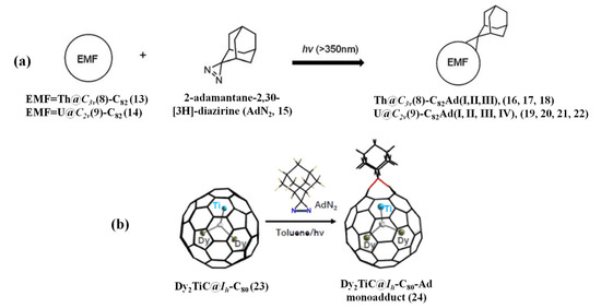 Recently, the carbene reaction was extended to the actinide EMFs, Th@C3v(8)-C82 and U@C2v(9)-C82, and the former afforded three mono-adducts, named Th@C3v(8)-C82Ad(I, II, III) (Ad = adamantylidene), while four mono-adducts were acquired for the latter, named U@C2v(9)-C82Ad(I, II, III, IV), presenting remarkably higher reactivity than lanthanide EMFs [69], as shown in Figure 4a. Both Th@C3v(8)-C82Ad(I) and U@C2v(9)-C82Ad(I) are [6,6]-open cage structures, which are unambiguously confirmed by single crystal X-ray crystallography [69]. Moreover, isomerization of Th@C3v(8)-C82Ad(II) and Th@C3v(8)-C82Ad(III) and U@C2v(9)-C82Ad(II) and U@C2v(9)-C82Ad(III) was observed at room temperature; however, Th@C3v(8)-C82Ad(I) and U@C2v(9)-C82Ad(I) showed high stability under the same condition [69]. DFT calculations suggested that carbon atoms with the largest negative charge density and POAV(p-orbital axis vector) values are the best sites toward the Ad addition [69]. Furthermore, compared to the lanthanide analogs, the unusually high reactivity of Th@C3v(8)-C82 and U@C2v(9)-C82 steamed from much closer metal–cage distance, increased metal-to-cage charge transfer, and strong metal–cage interactions, which is due to the significant contribution of extending Th-5f and U-5f orbitals to the occupied molecular orbitals [69].