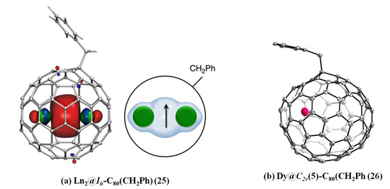 Liu et al. reported that an array of air-stable dimetallofullerene Ln2@C80(CH2Ph) (Ln2 = Y2, Gd2, Tb2, Dy2, Ho2, Er2, TbY, TbGd) (25) was acquired by reacting metallofullerene anions with benzyl-bromide in DMF (N,N-Dimethylformamide) solution [74]. Single-crystal X-ray diffraction of Ln2@C80(CH2Ph) shows that the benzyl is attached to the cage via a single bond, see Figure 5a [74]. Moreover, there is a covalent lanthanide–lanthanide bond in Ln2@C80(CH2Ph) and a single electron residing on the metal–metal bonding orbital [74]. Thanks to very strong exchange interactions between 4f moments and the residing single electron, Tb2@C80(CH2Ph) is a robust nanomagnet and shows a gigantic coercivity of 8.2 Tesla at 5 K and a high 100 s blocking temperature of magnetization of 25.2 K [74].
