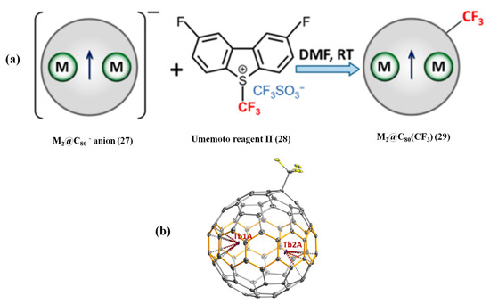 The lack of selectivity of the radical addition reactions results in multi-adducts and a complicated separation process. Unprecedentedly, the high selectivity of electrophilic trifluoromethylation of metallofullerene anions was reported very recently [78]. Specifically, reacting metallofullerene anions extracted by DMF with Umemoto reagent II affords M2@C80(CF3) (M = Tb, Y) mono-adducts as the major product, indicating higher selectivity of electrophilic trifluoromethylation than that of benzyl bromide reaction (see Figure 6a) [78]. The single-crystal X-ray diffraction analysis shows that the CF3 group is attached to the pentagon/hexagon/hexagon junction ([5,6,6] position) of the Ih-C80 cage via a single bond, as shown in Figure 6b [78]. Similarly, a single electron remains between two Tb ions, forming single-electron metal–metal bonds with the formal metal oxidation state of Tb2.5+ [78]. As expected, Tb2@C80(CF3) is also a robust single-molecule magnet based on magnetic characterizations, which is comparable to the benzyl mono-adduct Tb2@C80(CH2Ph) [78]. Therefore, electrophilic trifluoromethylation is a very excellent approach to stabilize metallofullerene anions M2@C80, which is a simple, fast room-temperature reaction with high selectivity and needs less time for required HPLC separation compared to the benzylation reaction of M2@C80 [78].