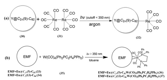 (a) Reaction scheme of Y@C2v(9)-C82 with Re2(CO)10. Reproduced from Ref. [80] with permission from the Royal Society of Chemistry. (b) Reaction of W(CO)4(Ph2PC2H4PPh2) with Eu@C2(5)-C82 or Eu@C2(13)-C84. Reproduced from Ref. [81] with permission. Copyright 2019 American Chemical Society.