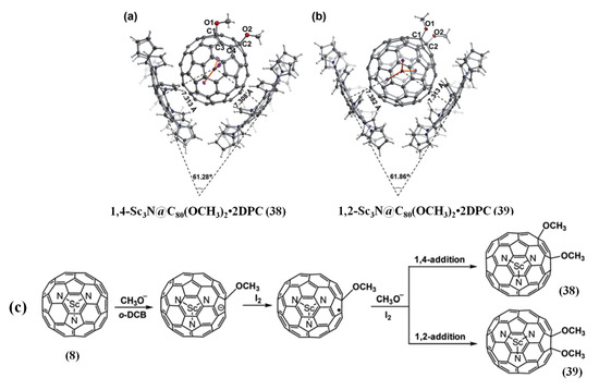 Unexpected bis-methoxyl adducts of Sc3N@Ih-C80 were got for the first time when Sc3N@Ih-C80 reacted with/without Ph2C=O, PhC≡CPh or PhC≡N in the presence of tetrabutylammonium hydroxide (TBAOH) stored in CH3OH [82]. However, it was further observed that bis-methoxyl adducts of Sc3N@Ih-C80 form irrespective of the presence of other reagents, since TBAOH in CH3OH efficiently boosts the -CH3O addition [82]. Furthermore, single crystal X-ray diffraction analysis unambiguously determines the molecular structures of the products as 1,4- and 1,2-bis-methoxyl adducts, and the conformations of the two -OCH3 groups in both bis-methoxyl adducts are obviously different bis-methoxyl, as shown in Figure 8a,b [82]. And, the planar Sc3N cluster in 1,4-bis-methoxyl adducts (38) is orthogonal with the plane crossing the addition sites, whereas the metal cluster in 1,2-bis-methoxyl adducts (39) is nearly parallel to the plane crossing the addition site, which indicates that exohedral modification is practical to control the orientation of the embedded cluster bis-methoxyl [82]. In addition, a possible mechanism related to an anion addition and a radical reaction was put forward (see Figure 8c), which opened up new horizons to the highly selective reactions between the methoxyl anion and EMFs [82]. Specifically, CH3O- generated by deprotonates CH3OH via TBAOH prevailed over OH- (from TBAOH) in the o-DCB (o-dichlorobenzene) solution and attached to Sc3N@C80 to form the mono-anion [Sc3N@C80(OCH3)]− firstly [82]. Then, the mono-anion was oxidized to [Sc3N@C80(OCH)•radical by I2, and the dimethoxyfullerene anion [Sc3N@C80(OCH3)2]− formed by accepting another CH3O− [82]. Finally, the ultimate 1,2- or 1,4-addition dimethoxyfullerene products were yielded through the oxidation of dimethoxyfullerene anion by I2 [82].
