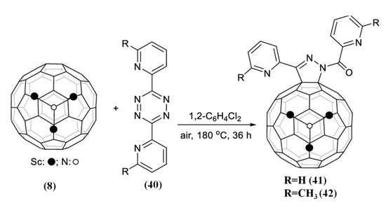 Very recently, pyrazoline-fused metallofullerene derivative (41) as shown in Figure 9 was generated from a four-component cascade reaction of Sc3N@Ih-C80 with 3,6-di(pyridin-2-yl)-1,2,4,5-tetrazines (40), H2O, and O2 [83]. The [5,6] pyrazoline-fused structure is remarkably different from the reaction of a 1,2,4,5-tetrazine with Sc3C2@Ih-C80 which provided a bis-fulleroid derivative [84]. Moreover, the reaction was extended to 3,6-bis(6-methylpyridin-2-yl)-1,2,4,5-tetrazine, and a similar [5,6] pyrazoline-fused derivative (42) was achieved [83]. Furthermore, a plausible formation mechanism of pyrazoline-fused metallofullerenes is proposed, which involved a complicated sequence of Diels–Alder reaction, retro Diels–Alder reaction with N2 extrusion, hydration reaction, rearrangement reaction, and oxidative dehydrogenation reaction [83].