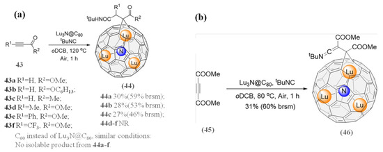 | tBuNC and dimethyl acetylenedicarboxylate (DMAD) | Lu3N@C80C(COOMe)C(COOMe)CNtBu | [6,6]-open | 1 | [85] | ||