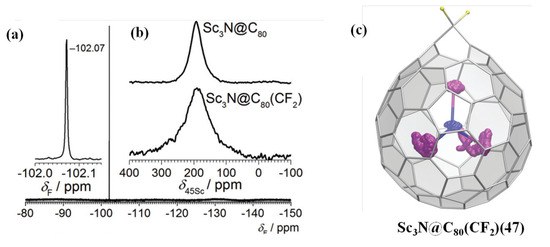 - Pykhova, A.D.; Semivrazhskaya, O.O.; Samoylova, N.A.; Rybalchenko, A.V.; Rosenkranz, M.; Ioffe, I.N.; Popov, A.A.; Goryunkov, A.A. Addition of CF2 group to endohedral fullerene Sc3N@Ih-C80. Dalton Trans. 2020, 49, 9137–9147. [Google Scholar] [CrossRef] [PubMed]