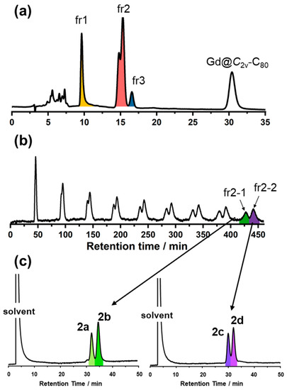 (a) HPLC profile of the reaction mixture (colors indicate the areas of each fraction). Conditions: Buckyprep (φ 4.6 × 250 mm), toluene, 1 mL/min. (b) Recycling HPLC profile of fraction 2. Conditions: Buckyprep (φ 20 × 250 mm), toluene, 7 mL/min. (c) HPLC profiles of fractions 2-1 and 2-2. Conditions: 5PBB (φ 4.6 × 250 mm), toluene, 1 mL/min.