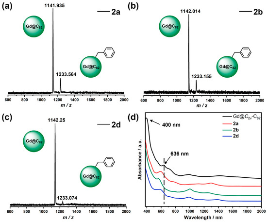 The optical properties that can provide crucial insights into the electronic structures were studied through the analysis of the UV-vis-NIR absorption spectra. As shown in Figure 2, the UV-vis-NIR spectra of 2a, 2b, and 2d show remarkably different behavior compared to that of the parent Gd@C2v-C82, which is attributed to the changes in the electronic structure of the cage caused by the addition of the benzyl groups [45]. The characteristic absorption of Gd@C2v-C82 at λ = 636 nm undergoes a blue shift upon the addition of the benzyl groups, which can be explained by the reduction of the π-conjugated region in the molecule [44]. The characteristic band of Gd@C82 at 400 nm disappears in all benzyl adducts, which is ascribed to the quenching of unpaired electrons by the odd number of benzyl groups on the Gd@C82 cage. A similar phenomenon was observed in the absorption of Gd@C82 morpholine derivatives [44].