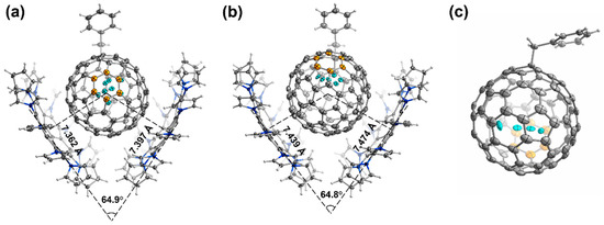 Single crystal X-ray diffraction measurement is widely accepted as the most reliable technique for analyzing the structure of isomers [46,47,48,49]. It provides solid evidence for the structure confirmation of 2a, 2b, and 2d. We made efforts to obtain single crystals for all the products, unfortunately, only products 2a, 2b, and 2d were successfully crystallized. Figure 3 displays the single crystal structures of the three isomers, namely, 2a, 2b, and 2d. Notably, 2a and 2b were co-crystallized with decapyrrylcorannulene (DPC) molecules [50]. The DPC molecules were found to form a V-shaped structure when combined with 2a and 2b, with the angle between the DPC molecules being 64.9° and 64.8°, respectively. The arrangement of these two molecules is very similar to other reported structures [51,52,53,54]. In 2a·2DPC, the distances between the centroid of the C82 cage and the central five-membered rings of DPC molecules are 7.361 Å and 7.394 Å, while they are 7.439 Å and 7.474 Å in 2b·2DPC. From there, it can be deduced that the distance between the carbon cage and the DPC is approximately 2.8–3.2 Å, indicating the presence of π-π interactions between the carbon cage and DPC molecules. These π-π interactions play a significant role in stabilizing the co-crystallized structure of 2a and 2b with DPC molecules. All three crystals feature a monoclinic P21/c space group. The carbon cages and embedded Gd atoms (in cyan color) display varying degrees of disorder. An interesting observation is that, irrespective of the location of the benzyl addition, the Gd atoms with major occupancy are consistently found underneath a hexagonal ring along the C2 axis of the C2v-C82 cage (marked in orange in Figure 3). And, the distances between Gd and the adjacent carbon atoms, ranging from 1.9 Å to 2.4 Å, indicate a strong interaction between the endohedral Gd and the outer C2v-C82 cage.