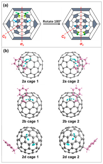 As depicted in Figure 3, the benzyl group was added in the form of a single bond at the [5,6,6]-ring junction of the C2v-C82 cage. Despite the addition, the C2v symmetry of the cage is preserved, indicating that the attachment of the benzyl group did not disrupt the overall symmetry of the molecule (Figure 4). Interestingly, all three crystal structures of 2a, 2b, and 2d contain mirror-symmetric enantiomers, suggesting that each compound exists in a pair of structures that are mirror images of each other. To gain a better understanding of the addition sites and the arrangement of the benzyl groups in each enantiomer, a Schlegel diagram of the C2v-C82 cage was mapped. In this diagram, the addition sites of the benzyl groups in each enantiomer are marked (1–2 for 2a, 3–4 for 2b, and 5–6 for 2d) (Figure 4a), providing valuable insights into the spatial orientation and symmetry of the derivatives. It can be observed that the addition sites in structures that are mutually enantiomeric are mirror-symmetric. The denoted sites 1 and 2 refer to cage 1 and cage 2 of 2a, sites 3 and 4 refer to cage 1 and cage 2 of 2b, and sites 5 and 6 refer to cage 1 and cage 2 of 2d. Figure 4b displays the mirror-symmetric enantiomers for 2a, 2b, and 2d. For every isomer, there is an identical structure that is a mirror image of the original isomer. Owing to the existence of the C2 axis, the addition sites labeled as 1′ to 6′ on the cage are equivalent to the corresponding sites of 1 to 6.