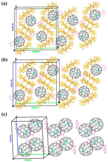 The crystal packing and molecular organization for each isomer were studied. As shown in Figure 5, the smallest asymmetric unit for the three products consists of four fullerene cages. Furthermore, 2a and 2b are arranged in a head-to-tail mode with DPC molecules along the b-axis. Additionally, the DPC molecules adopt an S-shape configuration along the c-axis. The distances between the two back-to-back DPC molecules are in the range of 3.4–3.8 Å, indicating the existence of π-π interactions. These interactions lead to favorable π-electron overlap and stabilize the crystal packing. The crystal structure of 2d without DPC co-crystallization reveals the formation of a one-dimensional zigzag supramolecular chain along the b-axis. The detailed crystallographic data for these compounds can be found in the experimental section.