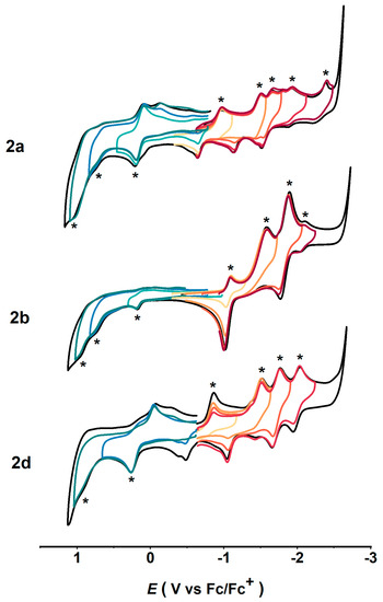 Cyclic voltammograms of 2a, 2b, and 2d recorded in a 0.05 M solution of TBAPF6 in o-DCB at a scan rate of 100 mV s−1. (The redox processes are labeled with a star and each process is indicated in different colors).