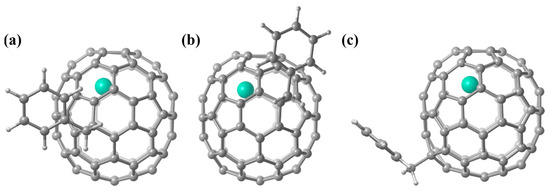 Endohedral metallofullerenes (EMFs) have garnered substantial attention from scientists due to their exceptional chemical and physical properties [1,2,3,4,5,6,7,8,9]. Since the discovery of the first solvent-extractable EMF, La@C82 [10], there has been a boom in interest in EMFs. According to the electronic structure, EMFs are categorized into two main groups: closed-shell EMFs and open-shell EMFs. Closed-shell EMFs possess completely filled electron shells, meaning that all the molecular orbitals are paired with electrons. Consequently, they exhibit a stable and relatively non-reactive structure. In contrast, open-shell EMFs have partially filled electron shells, resulting in the presence of unpaired electrons in their molecular orbitals. This characteristic makes them more reactive and prone to chemical reactions [11,12,13]. Nevertheless, compared with closed-shell EMFs, the reaction of open-shell EMFs is relatively less studied.