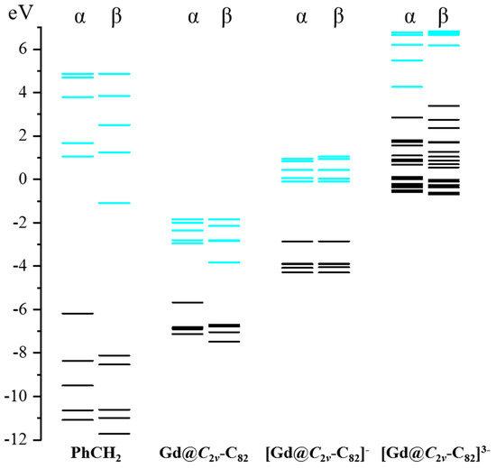 Frontier molecular orbital energy levels of PhCH2 radical and Gd@C2v-C82 in different charge states (occupied: black; unoccupied: cyan).