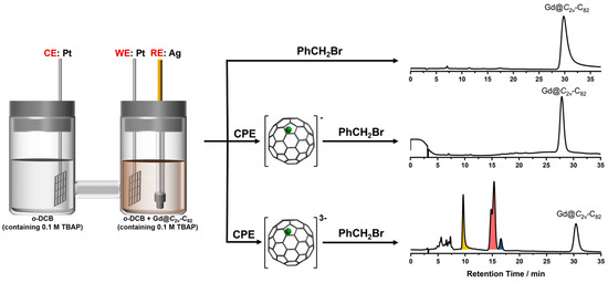 Despite Gd@C2v-C82 having an unpaired electron, it does not exhibit reactivity towards benzyl bromide (PhCH2Br) as shown in Scheme 1. As previously known, Gd@C82 demonstrates its capability as an excellent electron acceptor, with the capacity to accept up to seven electrons [38,39]. Electrochemical reduction can be used to selectively synthesize fullerene anions by controlling the applied potential. To enhance the reactivity, Gd@C2v-C82 was subjected to electrochemical reduction, specifically to its monoanion, using controlled potential electrolysis (CPE). The resulting Gd@C2v-C82 monoanion was then subjected to the benzylation reaction. However, it was observed that the monoanion also shows no reactivity toward PhCH2Br (Scheme 1), indicating that the nucleophilicity of the Gd@C2v-C82 monoanion is not sufficiently strong to attack the carbon cation (C+) of PhCH2Br. Therefore, additional electrons were added to the Gd@C2v-C82 cage through the CPE process. According to the cyclic voltammogram of Gd@C2v-C82, the second reduction is a simultaneous two-electron transfer process [27,39]; therefore, it is rational to consider the anions obtained via CPE to be trianions. Once the electrogeneration of [Gd@C2v-C82]3− was completed, PhCH2Br was added to the solution in one portion and stirred for 3h. High performance liquid chromatography (HPLC) observation confirms the occurrence of the reaction between [Gd@C2v-C82]3− and PhCH2Br (Scheme 1). It is evident that [Gd@C2v-C82]3− shows enhanced reactivity toward PhCH2Br.