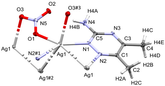In our recent study [33], we presented the synthesis and biological activity of [Ag2(2ClDAT)2(NO3)2(H2O)]n where 2ClDAT is 2-chloro-4,6-diamino-1,3,5-triazine. This complex was prepared by self-assembly of 2ClDAT with silver nitrate. In extension to this study, the self-assembly of the organic ligand 3-amino-5,6-dimethyl-1,2,4-triazine (3ADMT) and AgNO3 leads to the formation of a new crystalline silver(I) complex. 3ADMT is a good candidate because it has a triazine ring, which has the ability to coordinate the metal ion, and its amino and methyl groups can make inter- or intramolecular hydrogen bonding with other hydrogen bond acceptors. Also, the silver salt, AgNO3, was selected as an inorganic unit because it possesses the self-assembly capability to form a supramolecular complex through its bridging nitrate anion. These fragments can be linked together to form polymeric organic–inorganic hybrid architecture in which both the nitrate groups and the organic unit (3ADMT) act as bridging ligands, enhancing the stability of the crystalline polymeric silver(I) compound. The structure of the new complex has been confirmed by elemental analysis, infrared spectra, and SC-XRD to be [Ag(3ADMT)(NO3)]n.