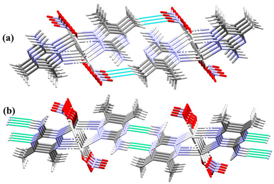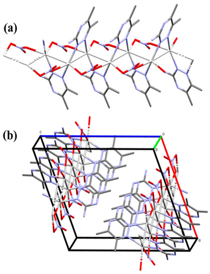 In this Ag(I) complex, there is one crystallographically independent Ag atom, which is tetra-coordinated by two N-atoms from two 3ADMT and two O-atoms from two nitrate groups where all ligands groups act as linkers between the Ag(1) centers. Table 1 presents selected interatomic distances and bond angles. The distances of the coordinate bonds Ag1–N1, Ag1–N2#1 (Symm. code: #1 1/2 − x, 1/2 + y, 3/2 − z), Ag1–O1, and Ag1–O3#3 (Symm. code: #3 x, −1 + y, z) are 2.2330(16), 2.2634(15), 2.4386(18), and 2.6293(17) Å, respectively. The N1–Ag1–N2#1 (Symm. code: #1 1/2 − x, 1/2 + y, 3/2 − z) and O1–Ag1–O3#3 (Symm. code: #3 x, −1 + y, z) angles are 149.29(6)° and 94.71(6)°, respectively. As a result, the coordination geometry of silver(I) in the complex could be described as a distorted tetrahedral augmented by argentophilic interactions, by which the silver atoms are connected in a coplanar and wavy-like manner to create a one-dimensional polymeric chain. The Ag1−Ag1#2 (Symm. code: #2 1/2 − x, y − 1/2, 3/2 − z) bond length is 3.2263(2) Å. This distance is quite short, representing a notable argentophillic interaction [39] that causes the 1D polymer to expand across the crystallographic b-axis (Figure 3). In addition to these argentophilic interactions, this polymeric sequence is further connected via the bridging of nitrate groups, which has a significant impact on the polymer expansion. As shown in Figure 3, the nitrate anion serves as a linker between the Ag(I) centers through Ag1–O1 and Ag1–O3 bonds along both sides around the Ag–Ag bonds. The organic ligand, 3-amino-5,6-dimethyl-1,2,4-triazine, is also acting as a bridging ligand, which is coordinated via its neighboring two nitrogen atoms, N1 and N2, to successive silver atoms, Ag1 and Ag1#2 (Symm. code: #2 1/2 − x, y − 1/2, 3/2 − z), linked by the argentophilic interactions, forming a trapezoid structure in which the two silver atoms construct the longer base and the two nitrogen atoms form the shorter base. The ligand units are arranged in an alternative pattern above and below the polymer array.